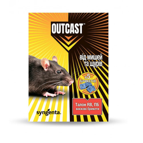Талон Outcast — це універсальний високоефективний родентицид у формі воскових брикетів, який характеризується надзвичайно високою поїданняністю навіть за наявності альтернативних джерел корму. Така привабливість забезпечує споживання кількості приманки, достатньої для загибелі гризуна після одного поїдання. Засіб легко дозується та ідеально підходить для закладання принади в будівлях, складських приміщеннях, сховищах, а також для використання в умовах підвищеної вологості, зокрема в каналізаційних системах.
